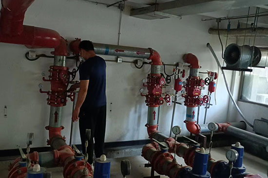 三、檢查消防供水設施:消防水池外觀,消防水箱外觀,消防水泵及控制柜工作狀態,穩壓泵、增壓泵、氣壓水罐工作狀態,水泵結合器外觀、標識,管網控制閥門啟閉狀態,泵房工作環境。