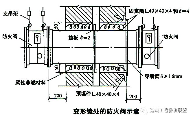 ③:風管穿越結構變形縫處應設置三防帆布柔性短管(消防風管采用防火帆布),其長度每邊長出變形縫寬度100mm。負壓風管要采用金屬軟接。